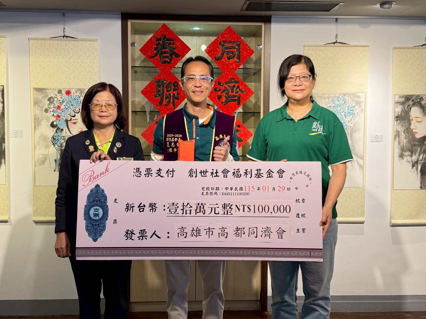 為支持創世基金會「植物人常年服務暨第36屆寒士吃飽30」經費,創世基金會與高都同濟會於1月29日上午10時30分,假高雄市中國書畫學會會館共同舉辦「書法義賣助送禮到家」公益行動。高都同濟會除捐助新台幣10萬元支持服務經費外,並號召會友透過書法義賣響應,以實際行動陪伴弱勢家庭溫暖過年。
