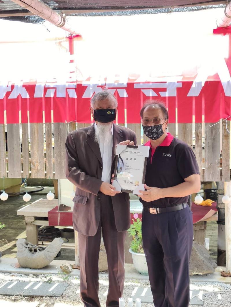 ▲臺灣離島有機友善農業發展協會理事長許長祿(右) 頒發感謝狀給立法院前參事王耀德 (左)