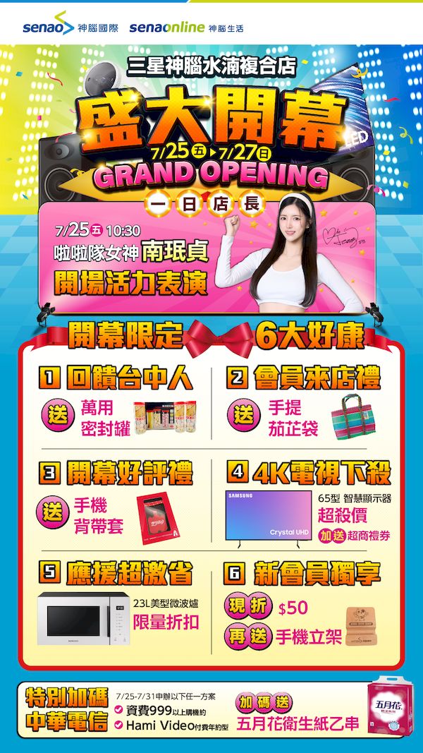 神腦與台灣三星電子攜手打造全台第一家「三星神腦複合店」正式落腳於台中水湳商圈,7月25日上午盛大舉辦開幕儀式,台灣三星電子總經理梁準原、神腦國際董事長余政憲、中華電信台中營運處總經理郭經權等多位貴賓親臨見證,不僅展現雙品牌強強聯手的企圖,更為在地商圈注入全新活力。當天特別邀請來自韓國、職棒啦啦隊女神南珉貞擔綱一日店長,帶來活力熱舞為開幕助陣,還親自體驗並分享三星家電的使用經驗,並與粉絲近距離互動合影,邀請民眾來感受三星家電的魅力。