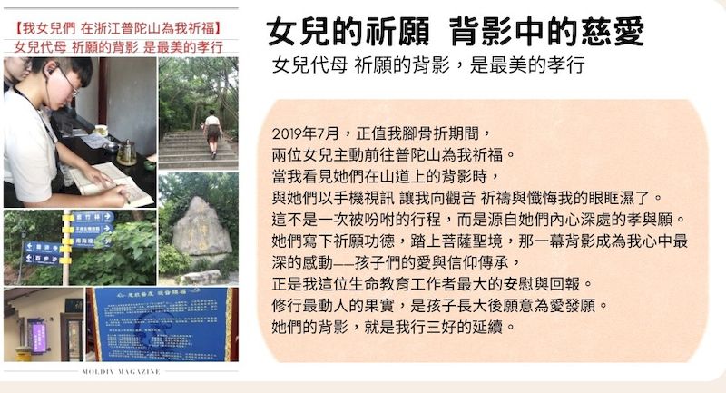 她回憶道:「父親是我一生的榜樣,行善行孝、無私奉獻;常董則是我職涯上的貴人,教會我做人做事的風範;星雲大師的『人間佛教』,讓我找到慈悲與智慧並重的道路;也讓我看見愛的信仰可以穿越宗教,成就共善。