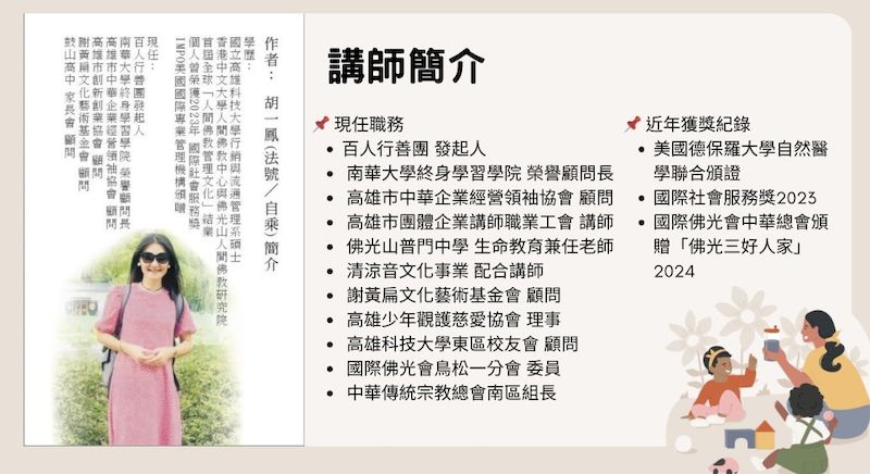 這場由百人行善團發起人,也是普門中學生命教育兼任教師、南華大學終身學習學院榮譽顧問長──胡一鳳老師主講,現場將分享她如何將「行三好」落實於生命歷程,感動許多教育、宗教與公益界人士。