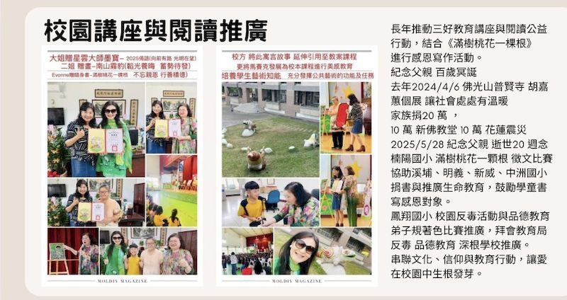 她亦以實際行動延續這份精神,如捐書、助學、助念祈福、推動文化藝術教育等,持續在社會各角落點亮善的火種。