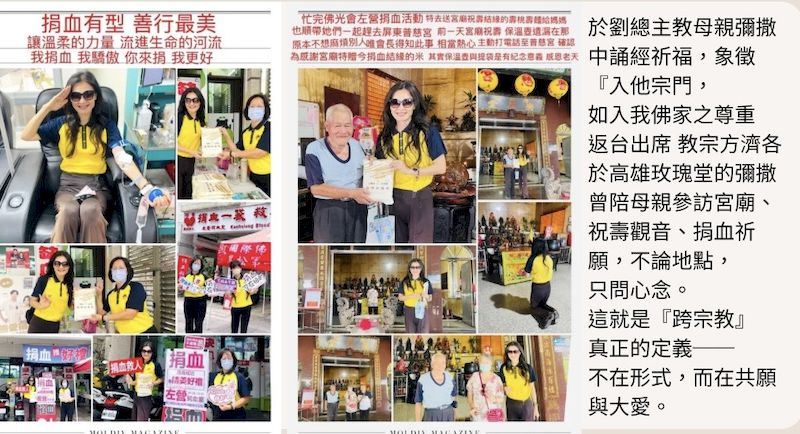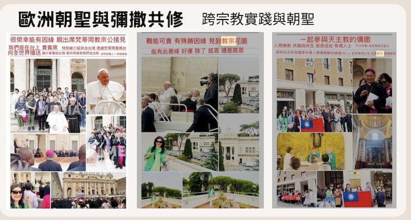 此外,胡老師亦曾隨天主教朝聖團遠赴歐洲,親自於梵蒂岡聖伯多祿大殿朝聖,她與團員當面接受教宗方濟各的祝福合影與教宗贈送天主教的玫瑰念珠,並與全球信眾共襄盛舉。當日她是團中唯一的佛教徒,此舉展現其尊重多元信仰、實踐跨宗教交流的慈悲精神與行動智慧。