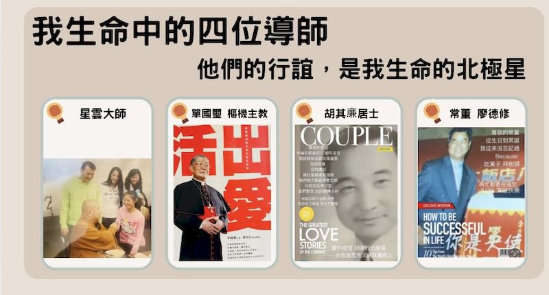 胡老師表示,自己的價值觀與生命觀深受四位生命貴人啟發——其父胡其亷居士、福華常董廖德修先生、佛光山開山祖師星雲大師,與天主教單國璽樞機主教。