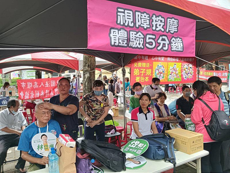 今天活動現場湧入近500人參與,現場有愛心攤位計有:山谷髮廊義剪、盲友免費體驗按摩、免費前100名抽血健康檢查及臻美診所醫護諮詢、晴空萬里法律事務所免費法律諮詢、中南莊園咖啡現場手沖招待等愛心市集計28攤位