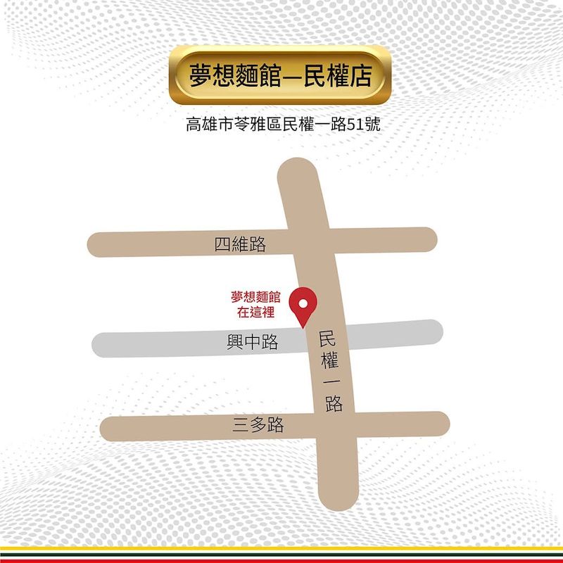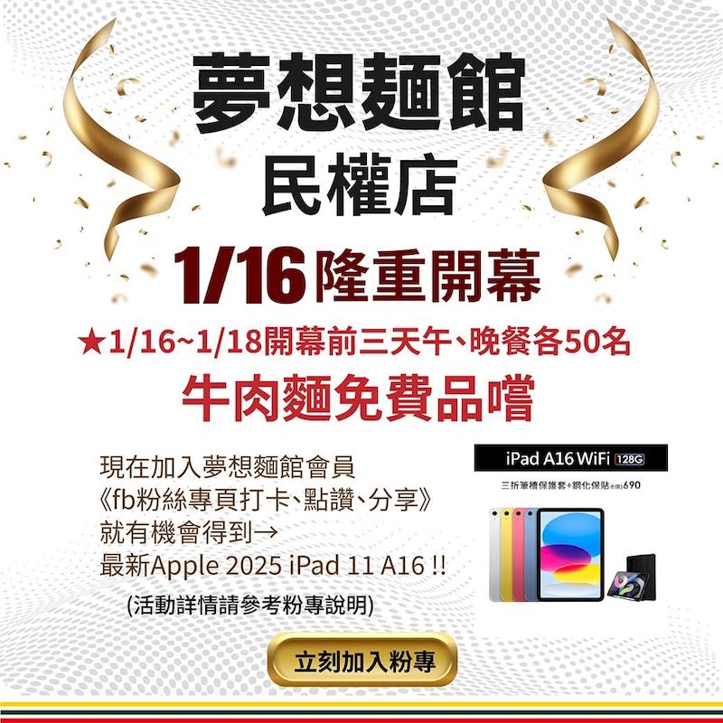 除免費試吃活動外,夢想麵館同步推出開幕抽獎活動,自 2026年1月16日至1月31日 止,只要加入夢想麵館 LINE@ 官方會員、追蹤並按讚夢想麵館 Facebook 粉絲專頁,並於活動期間至「夢想麵館民權店」消費,拍攝消費發票並於粉專指定活動貼文中打卡上傳照片,即可獲得抽獎資格。